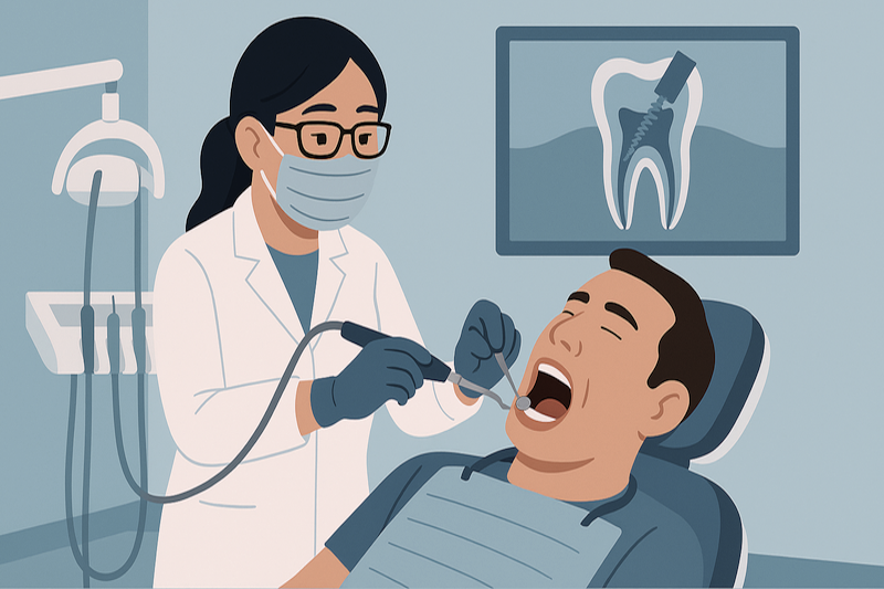 A root canal, also known as an “Endodontic procedure,” is necessary when deep decay reaches the tooth’s nerve, causing persistent pain, or when the tooth requires structural support for a crown. A tooth has three layers: enamel (outer), dentin (middle), and the pulp chamber (inner nerve). When decay penetrates to the pulp, the nerve can become infected, risking tooth loss.